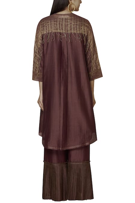A wine Chanderi silk tunic featuring an asymmetric hem, three-quarter sleeves with gold yoke and stitch detail, a round neckline, and a front buttoned placket. It is paired with a sleeveless wine inner with a round neckline.
