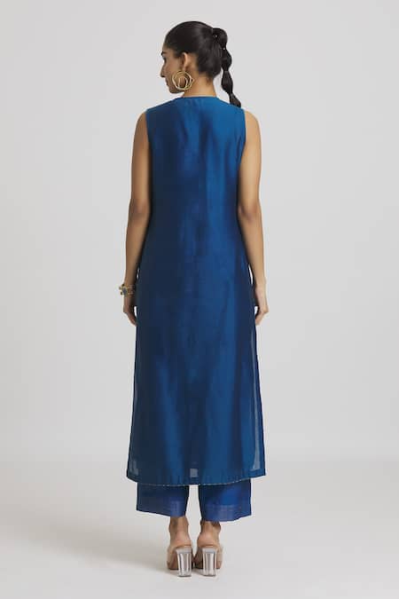 Blue Chanderi Silk Embroidery Round Neck Straight Tunic