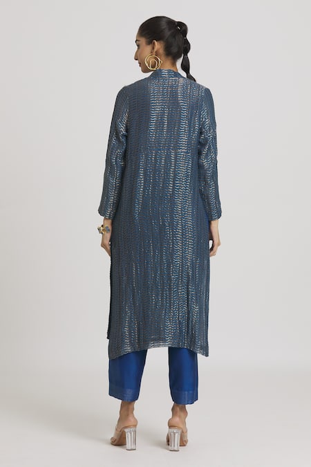 Indigo chanderi silk tunic featuring a metallic wavy stripe textured pattern