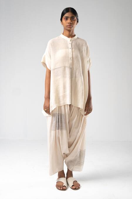 An antique white tunic crafted from handwoven cotton and linen silk, featuring a checkered panel, stitch detailing, mandarin collar, half sleeves, front button placket, and an asymmetric hem.