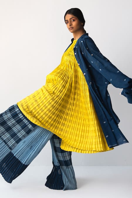 A yellow cotton dress featuring all-over checks, kantha detailing, and micro pleats.