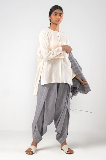 An antique white cotton top featuring a round neckline, full cuffed sleeves, front button placket, patch pocket, and a high-low hem with block print at the back.