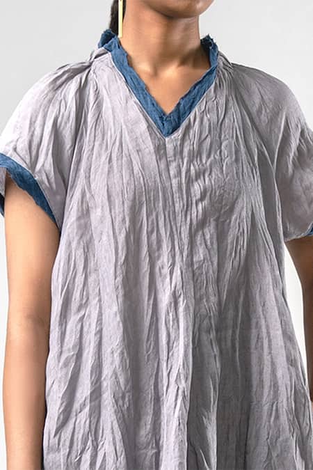 Gray Cotton, Linen V-neck Crushed Dress With Asymmetric Hem