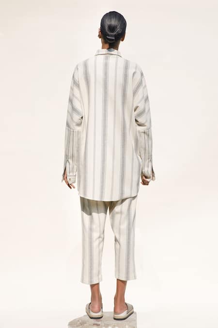 Off white pant in 100% handloom cotton featuring a striped pattern and kantha stitch lines