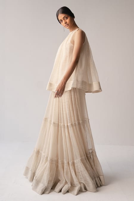 An antique white top crafted from linen noil fabric, featuring a round neckline, sleeveless design, all-over stitch lines, and kantha detailing.