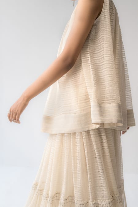 An antique white tiered skirt crafted from Linen Noil fabric, featuring all-over stitch lines and Kantha detailing.