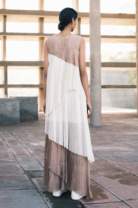 Beige and white color blocked gown featuring knife pleats and an asymmetric hem