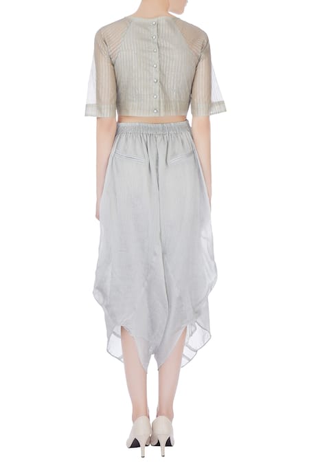 An ice blue crop top crafted from Kota silk, featuring zari woven striped detailing, sheer half sleeves, a round neckline, and back button closures.