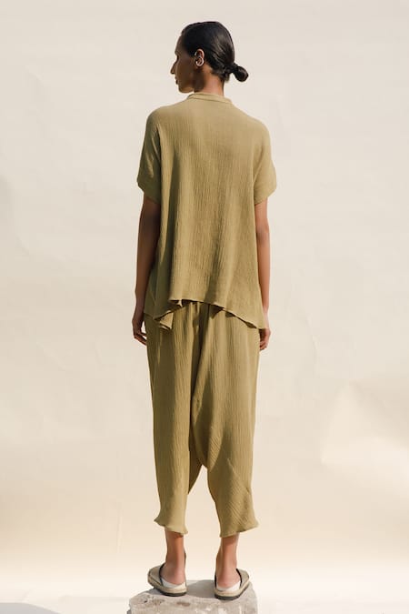 Ochre top featuring a band collar neckline and front button detailing