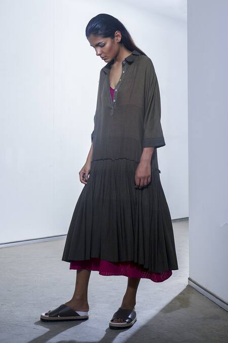 An olive organic cotton midi dress featuring a spread collar, three-quarter sleeves, and a button placket with a drop waist design.
