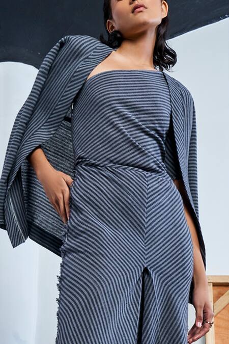 A grey one-shoulder jumpsuit crafted from organic cotton, featuring an asymmetric neckline, sleeveless design, and an all-over striped pattern.