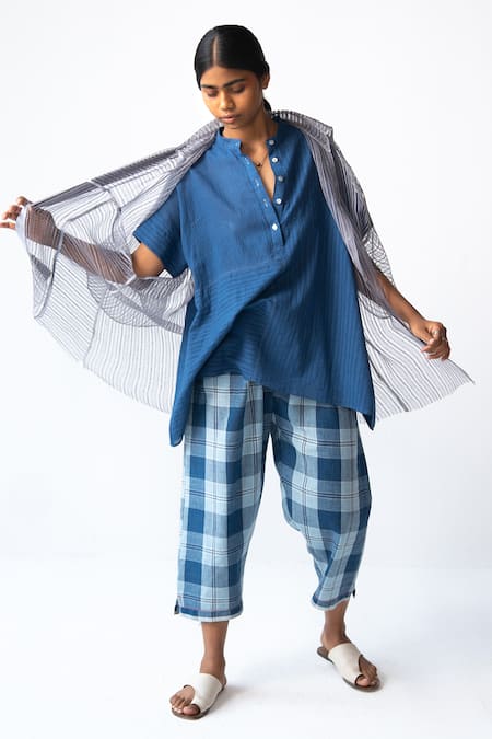 The blue tunic worn by the model is not for sale., The blue pant worn by the model is not for sale.