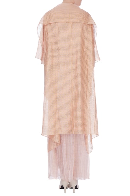 Peach Silk Zari Open Neck Woven Flap Collar Long Jacket