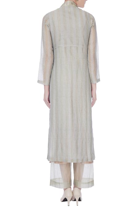 An ice blue sheer silk long jacket featuring a V-neckline, full sleeves, and a front open design with zari woven horizontal stripes.