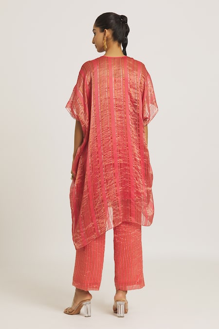 Coral dress featuring a square neckline and flared sleeves in zari tissue silk