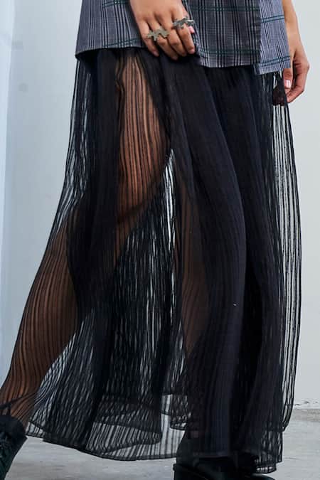 A black sheer maxi skirt crafted from Noil Silk, featuring a striped pattern and a flared silhouette.