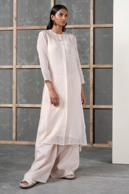 A veiled rose peach tunic made from Kota Cotton, featuring a spread collar, full sleeves, and a front button placket.