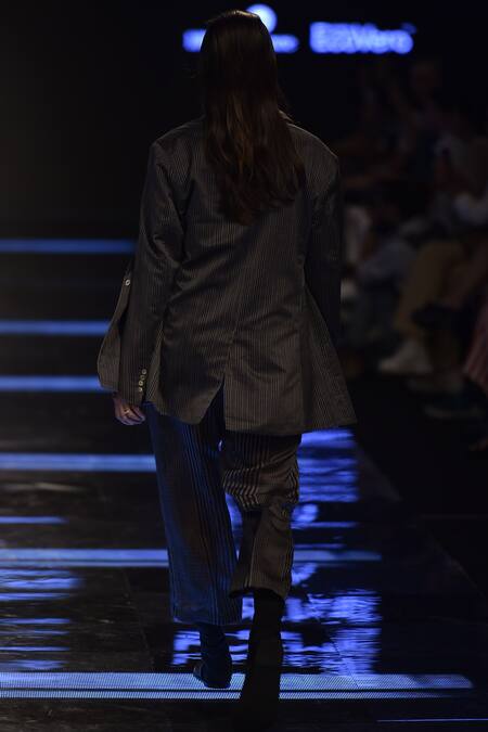 Buy_Urvashi Kaur_Gray Striped V Neck Blazer With Flap Pockets _at_Aza_Fashions