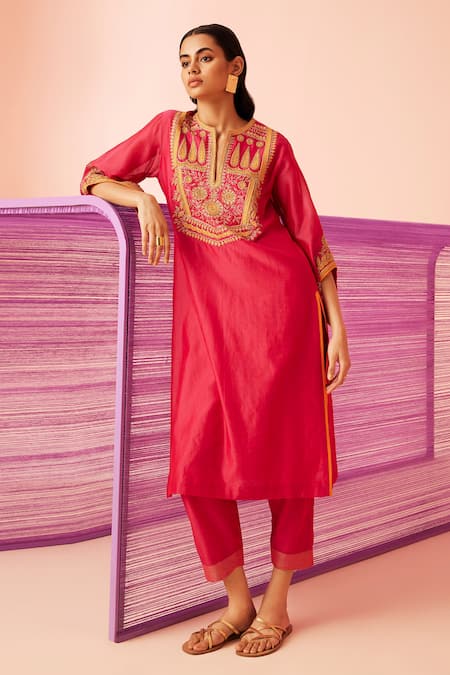 Buy_Sureena Chowdhri_Magenta Silk Chanderi Embroidered Zari Notched Round Neck Utopia Kurta Set_Online_at_Aza_Fashions