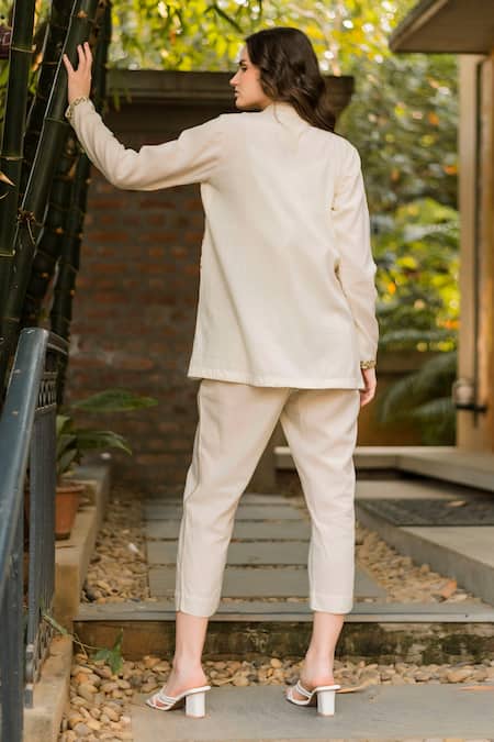 Shop_Vaani Beswal_Ivory Silk Embroidery Shawl Neck Abeer Thread Shrug _Online_at_Aza_Fashions