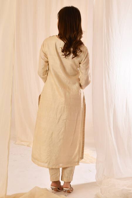Beige Handwoven Tussar Silk Round Bodice Embroidered Kurta And Pant Set
