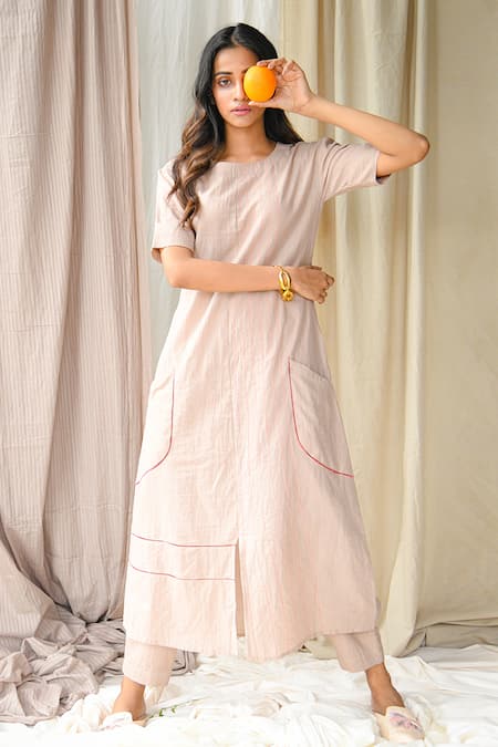 Beige Handwoven Cotton Round Neck Ekaja Tunic And Pant Set
