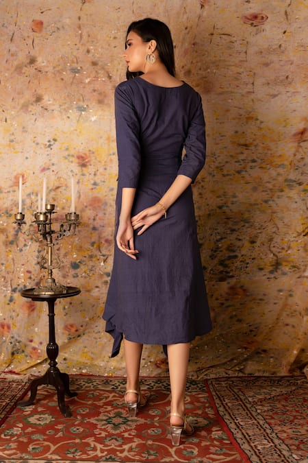 Blue draped dress with an asymmetrical hem & an attached stripe textured front tie-up belt.