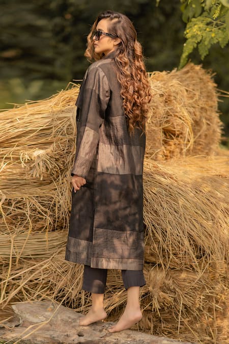 Black Handwoven Linen Work Notched Collar Itzal Trench Coat