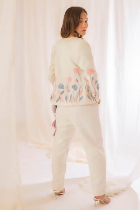 Off-white jacket with pink, blue kadai, floral embroidery on sleeve hem.
