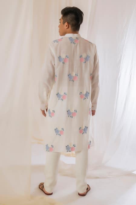 Off-white kurta with pintuck detailing in front & floral applique embroidered back.