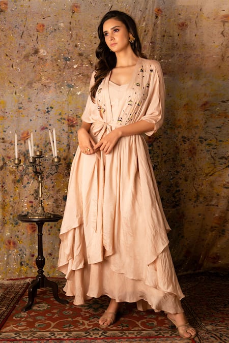 Pink kaftan with thread, bead work embroidered yoke & pintuck detailing. Paired with bralette & flounced skirt. Comes with a tie-up belt.