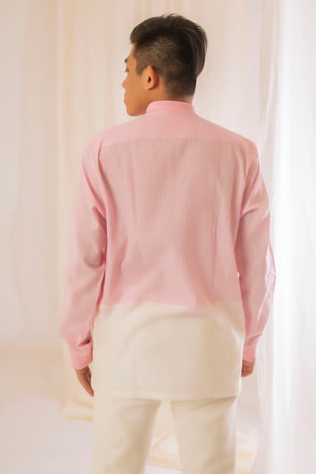 Pink, white colorblock shirt with stripe pattern & band collared neckline.