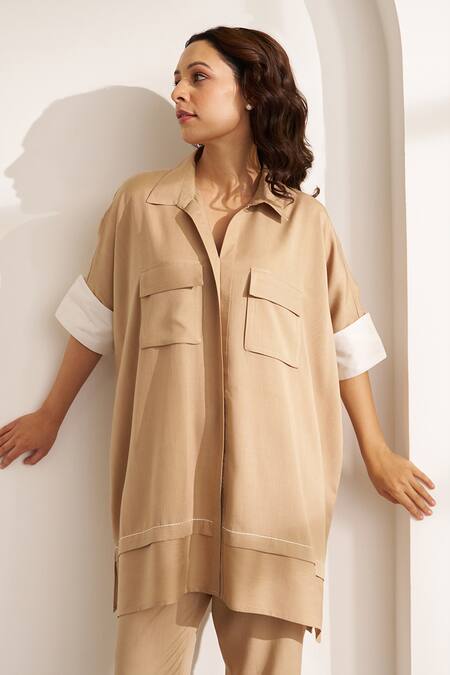 Oversized front pockets for added utility, Sharp collar design for a refined look, Fluid drape enhancing comfort and style
