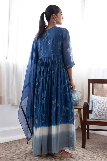 Ink blue ombre effect anarkali featuring abstract floral print and thread embroidery. Paired with a dupatta adorned with tassel details.