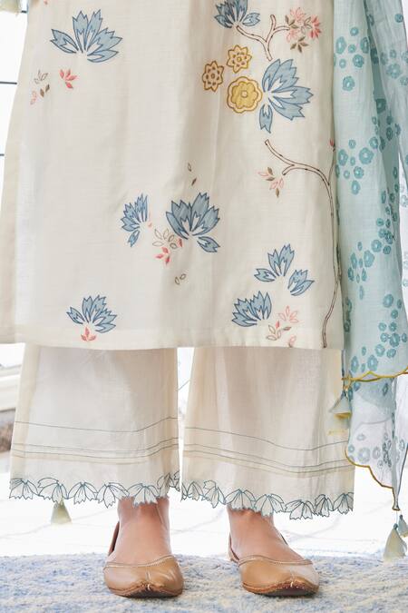Ivory kurta featuring a keyhole round neck with cascading floral applique thread embroidery. Paired with pants adorned with floral cut work hem and a dupatta showcasing an all-over floral print.
