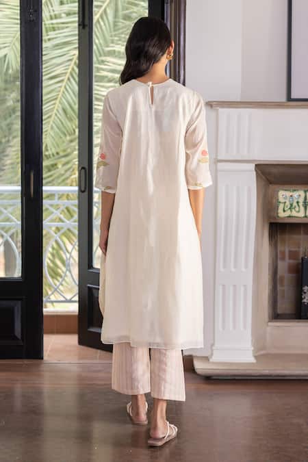 Off white kurta featuring floral applique work on the front and sleeves. Paired with a stripe pattern straight pant in muslin cotton.