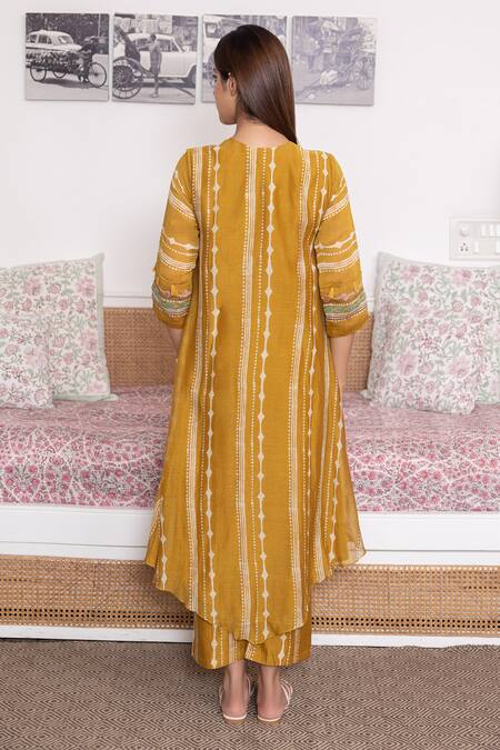 Yellow Cotton, Muslin Tassels Round Neck Linear Print Kurta With Pant