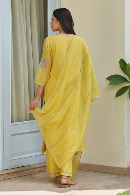 Yellow muslin cotton kurta featuring applique embroidery and a round neckline. Paired with matching pants and a dupatta.