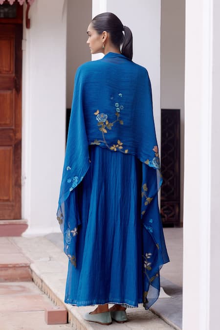 Sapphire blue anarkali featuring thread applique embroidery in floral pattern. Paired with a scallop bordered dupatta.