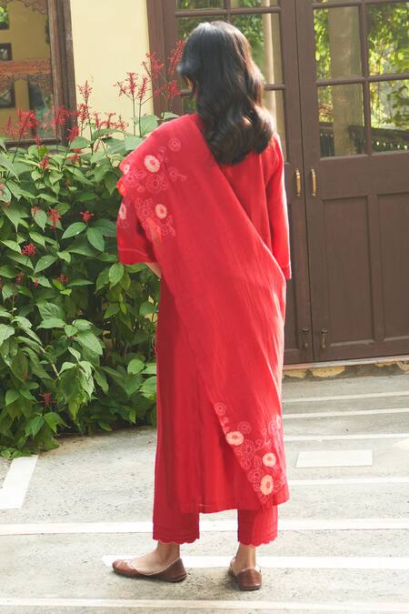 A crimson red Giza silk kurta featuring a round neckline and three-quarter sleeves, adorned with floral applique embroidery. It is paired with coordinating pants and a dupatta.