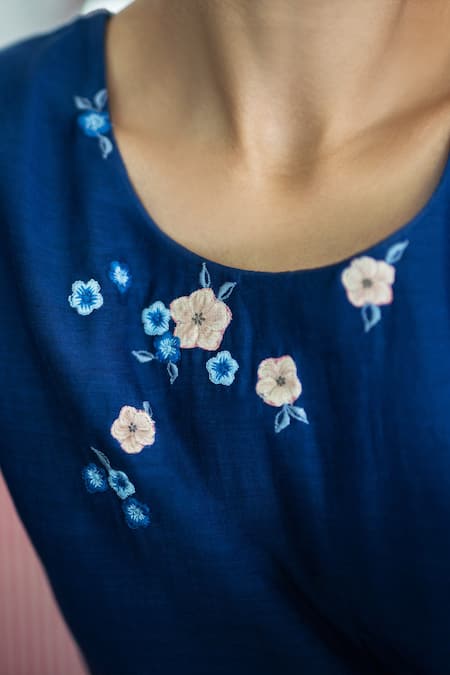 Blue Muslin Embroidery, Applique Round Neck Floral Kurta Pant Set