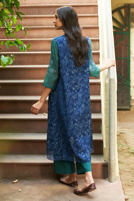 Delicate floral applique blooms on kurta and sleeves, Contrasting floral patterns on pants