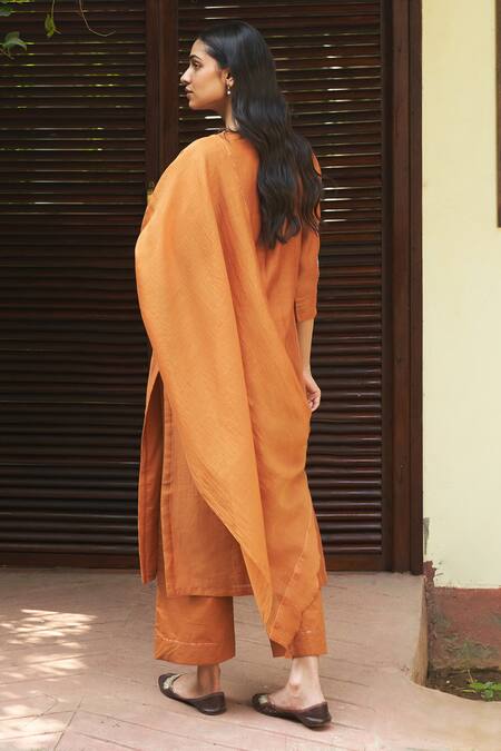 Orange Muslin, Cotton Embroidery Round Neck Floral Kurta Set