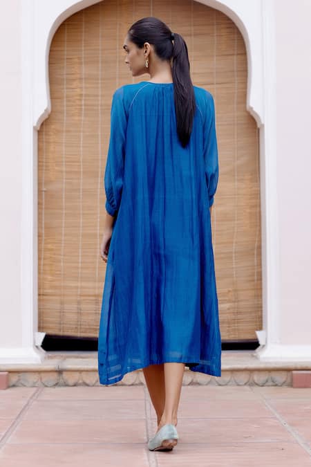 Sapphire blue midi dress featuring floral thread embroidery and delicate pintuck details