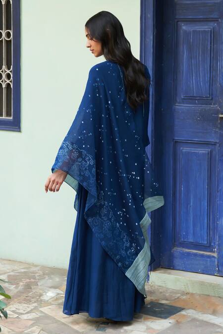 Indigo anarkali featuring thread work embroidery and a V neck. Paired with a floral printed dupatta.