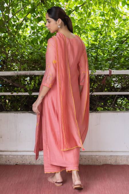 Orange kurta featuring floral applique work with thread embroidery and side slits. Paired with matching scallop-edged pant and dupatta.