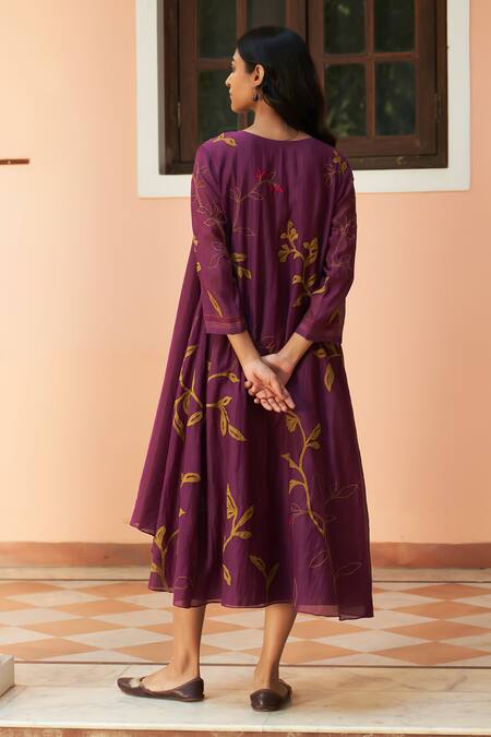Purple Muslin Embroidery Round Neck Jacket Style Midi Dress With Floral Applique