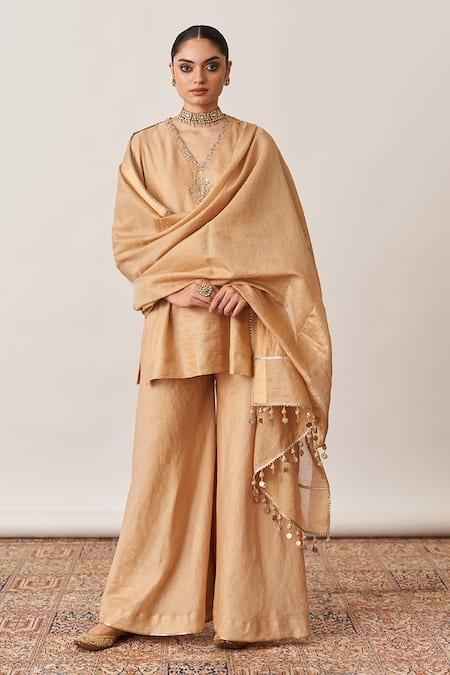Gold toned dupatta featuring intricate lace work and coin embellishments