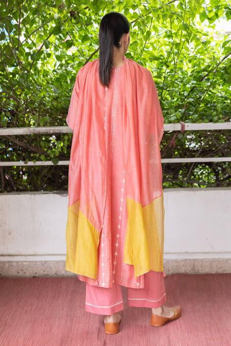 Pink straight kurta featuring a linear print and geometric embroidery. Paired with a matching pant and ombre dual shaded dupatta.