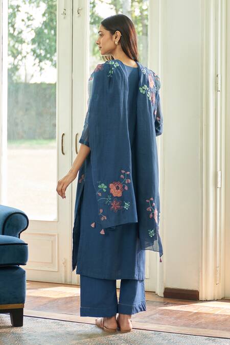 Ocean blue kurta featuring floral applique work and a straight cut. Paired with matching pant and a coordinating dupatta.